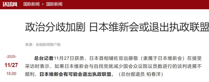 一来,据环球网报道,日本维新会突然朝高市早苗发难,称如果与自民党的谈判进展不顺利的话,可能退出执政联盟。
