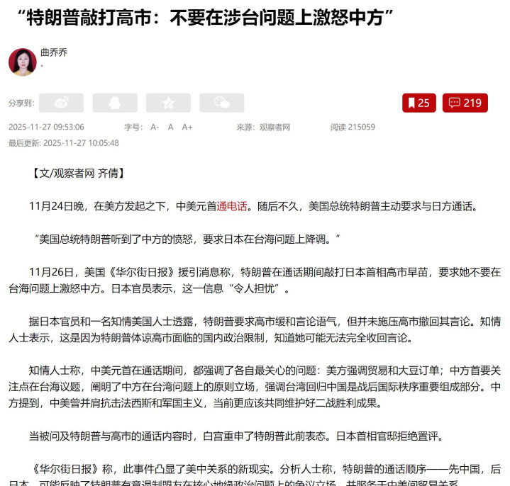 尽管刚一开始高市早苗支支吾吾,不愿意透露通话内容,但是美媒很快就憋不住了,一股脑全部倒了出来。