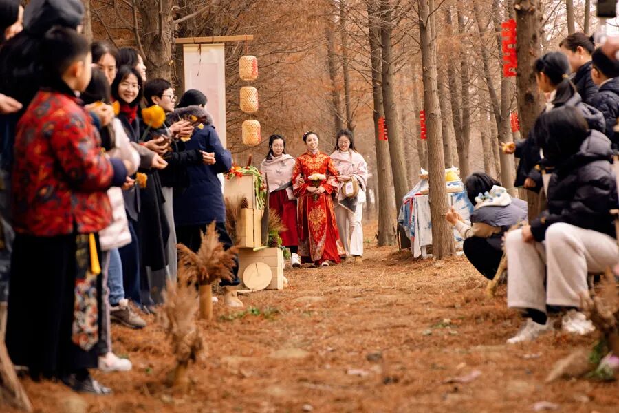 自由职业者“两瓶酱”带着一儿一女参加了婚礼。孩子们在地上捡起树叶,往银杏身上撒去,开心极了。婚礼结束后,他们还留下来帮忙收拾、清理,迅速让水杉林恢复了原貌。