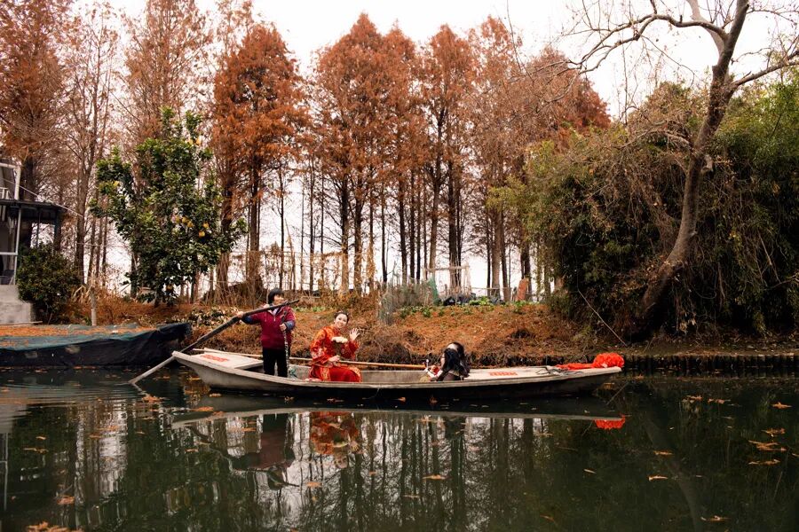 新娘银杏坐着小船从驿站旁的小河驶入水杉林