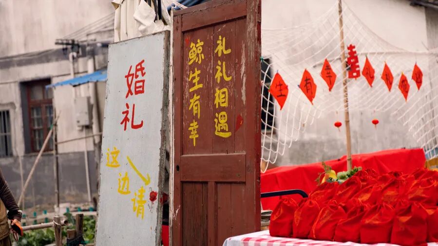 婚礼现场,用废弃门板做成的迎宾板