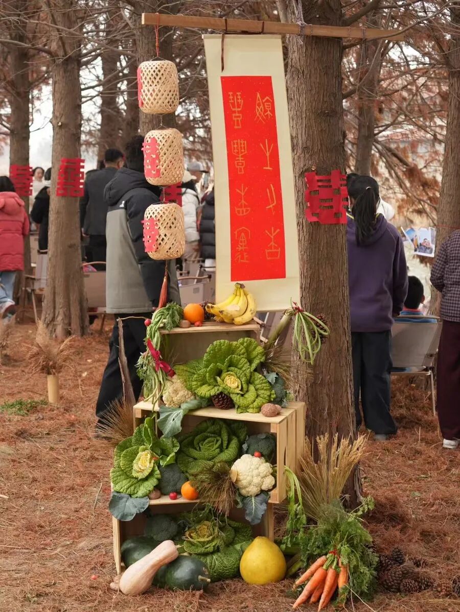 婚礼的每一处细节都藏着自然与环保的巧思:新娘的喜服是小姐妹结婚时穿过的;废弃的门板当“迎宾板”,生态农场的露天蔬菜、马路边捡拾的掉落松果,充当“气氛组”;橘子皮剪成花瓣压成装饰花,芦苇、高粱和水稻束插在竹筒里,作为步道迎宾花;木舞台是海豚亲手打造且重复使用的旧物,摊位架子是3年前从展览撤展拆解的 “老伙计”,毛毡喜字可回收;自制的喜糖喜饼装在可重复利用的不锈钢餐盒中……