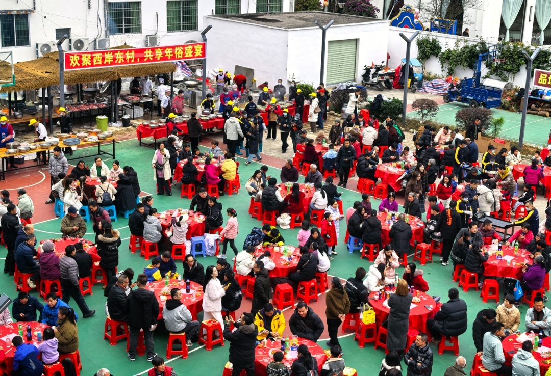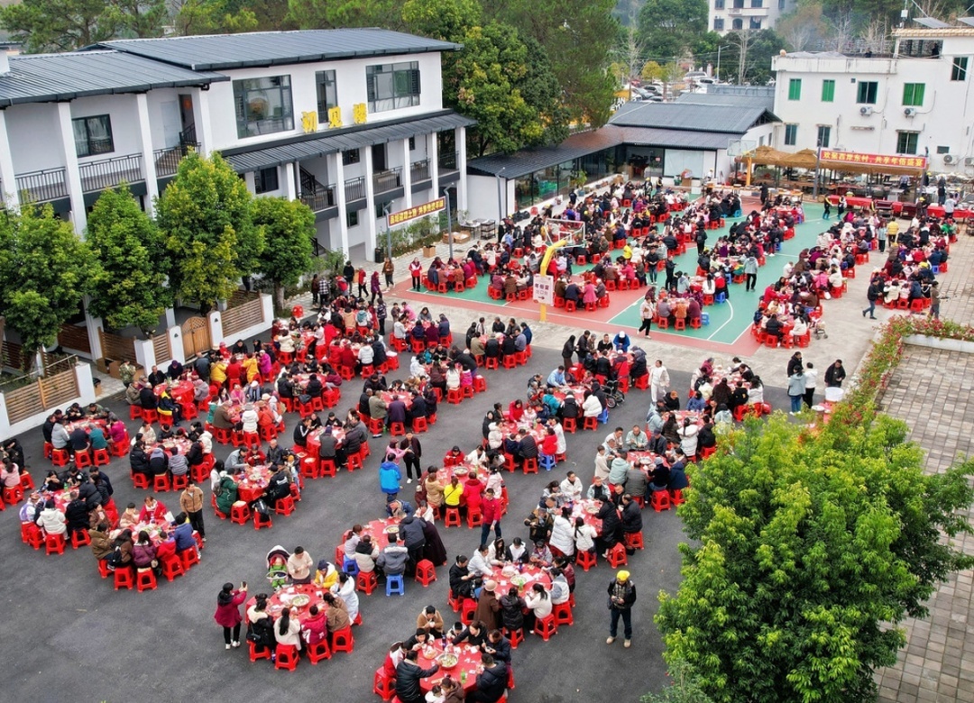 1月24日,连州市西岸镇东村村举办年俗宴,村民与游客共聚一堂,在热气腾腾的菜肴与欢声笑语中,感受日渐浓郁的年节氛围。